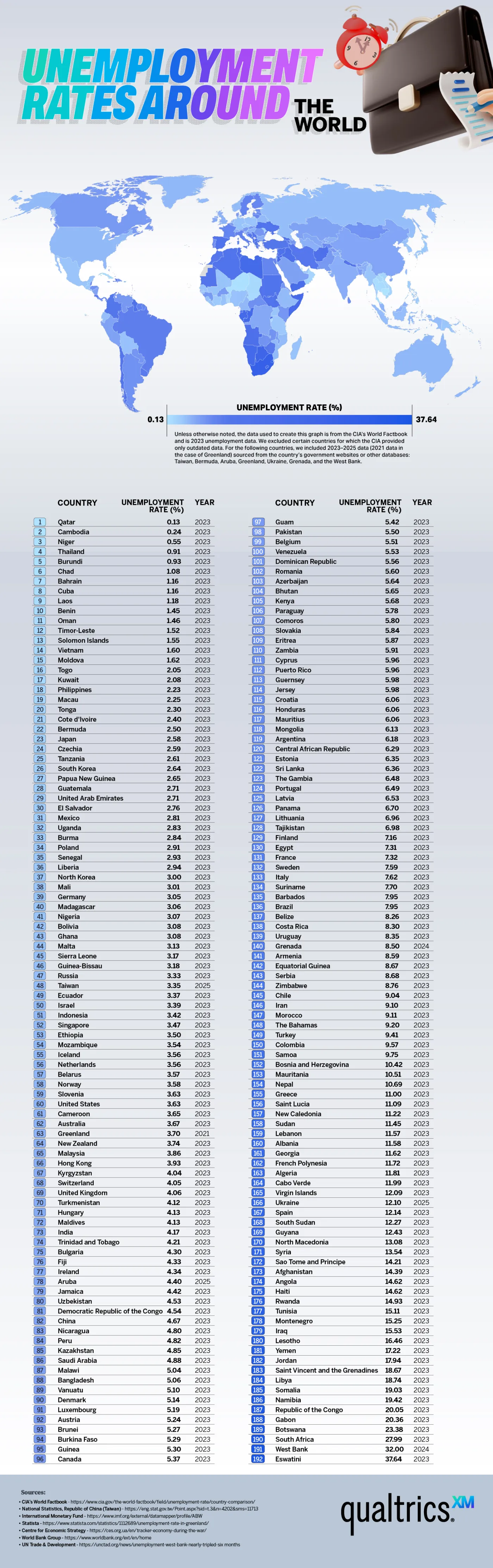 In summary, unemployment rates reveal much about the economic health and social dynamics of countries worldwide. While nations like Eswatini face challenges due to skill gaps and limited job opportunities, others, such as Qatar, benefit from abundant resources and thriving industries. The disparity highlights how factors such as labor force size, economic stability, and industry growth affect employment levels. Understanding these global patterns is essential for policymakers and organizations aiming to address unemployment and foster sustainable growth. By analyzing the causes and consequences, we can better support individuals and communities striving for economic security and opportunity.