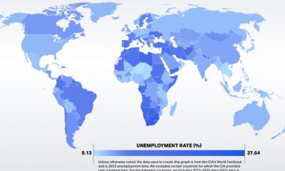 We see a very wide gap between the countries with the highest and lowest unemployment rates. Many factors can affect unemployment, but one of the biggest is changes in the size of the labor force. A struggling economy doesn’t necessarily indicate a high unemployment rate. If it’s difficult enough to find a job, people will give up, and they’ll no longer be counted in the unemployment numbers. That said, the unemployment rate does tend to increase in hard times. Global unemployment peaked in 2009 during the financial crisis.