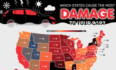 Car damage can occur for several reasons, and we’re all vulnerable to it at any time or place. Weather events are a huge factor in vehicle wear and tear. Hail can be a death sentence for your car, and intense UV radiation and heat can gradually destroy your car’s interior and paint job. Areas that must salt roads in winter do so to keep us safe on the road, but unfortunately, salt also damages cars and breaks down roads, leaving behind dangerous potholes. The Grease Monkey researchers took all these factors and considered them together to create a ranking system to show us the states that do the most damage to cars. Each state in the U.S. is ranked based on the severity of vehicle risk and deterioration.