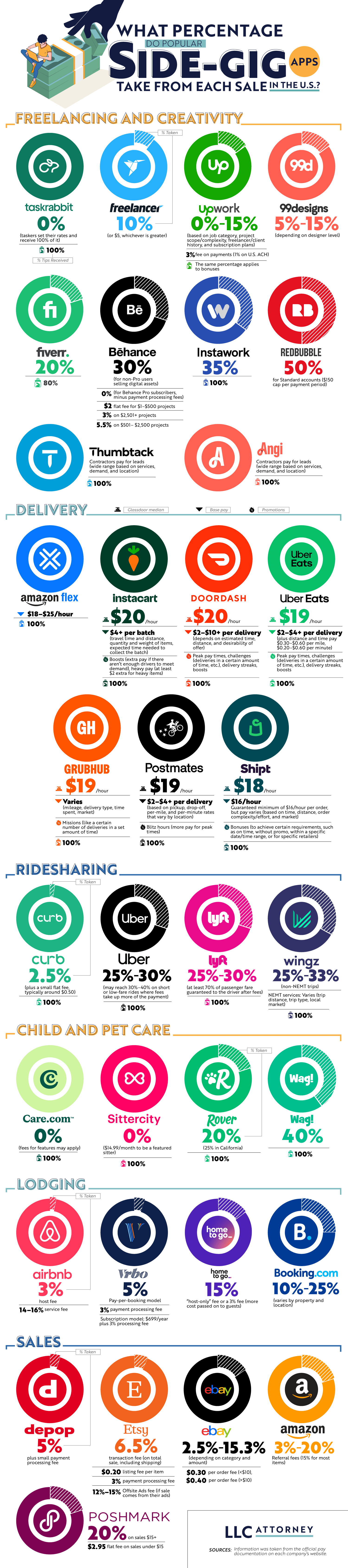 Rideshare Apps: Major platforms like Lyft and Uber typically take about 25% to 30% of passenger fares, and in some cases more for low-priced trips. Drivers do get to keep 100% of tips.